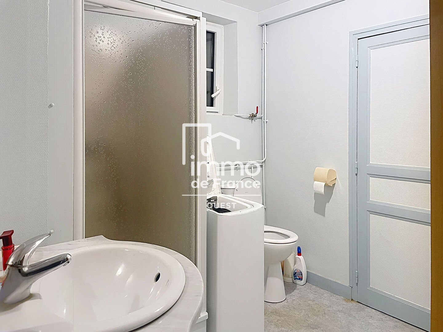 La salle d’eau, mitoyenne à la cuisine et à la chambre, se veut accessible et est accompagnée d’un WC.